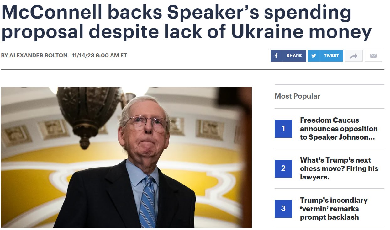 Лидер республиканцев в Сенате США Митч Макконнелл поддержал временный бюджет без пакетов для Украины и Израиля.