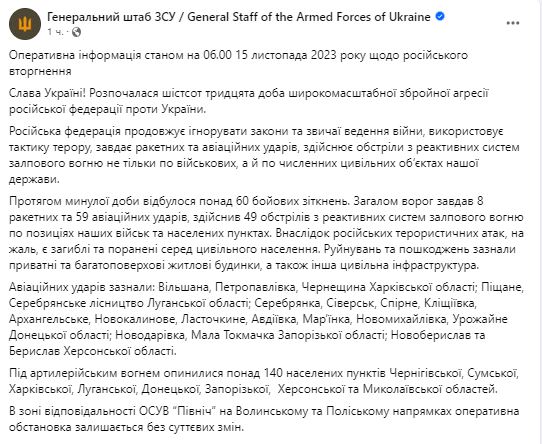 Утром 15 ноября Генштаб ВСУ обнародовал сводку о ситуации на фронте.