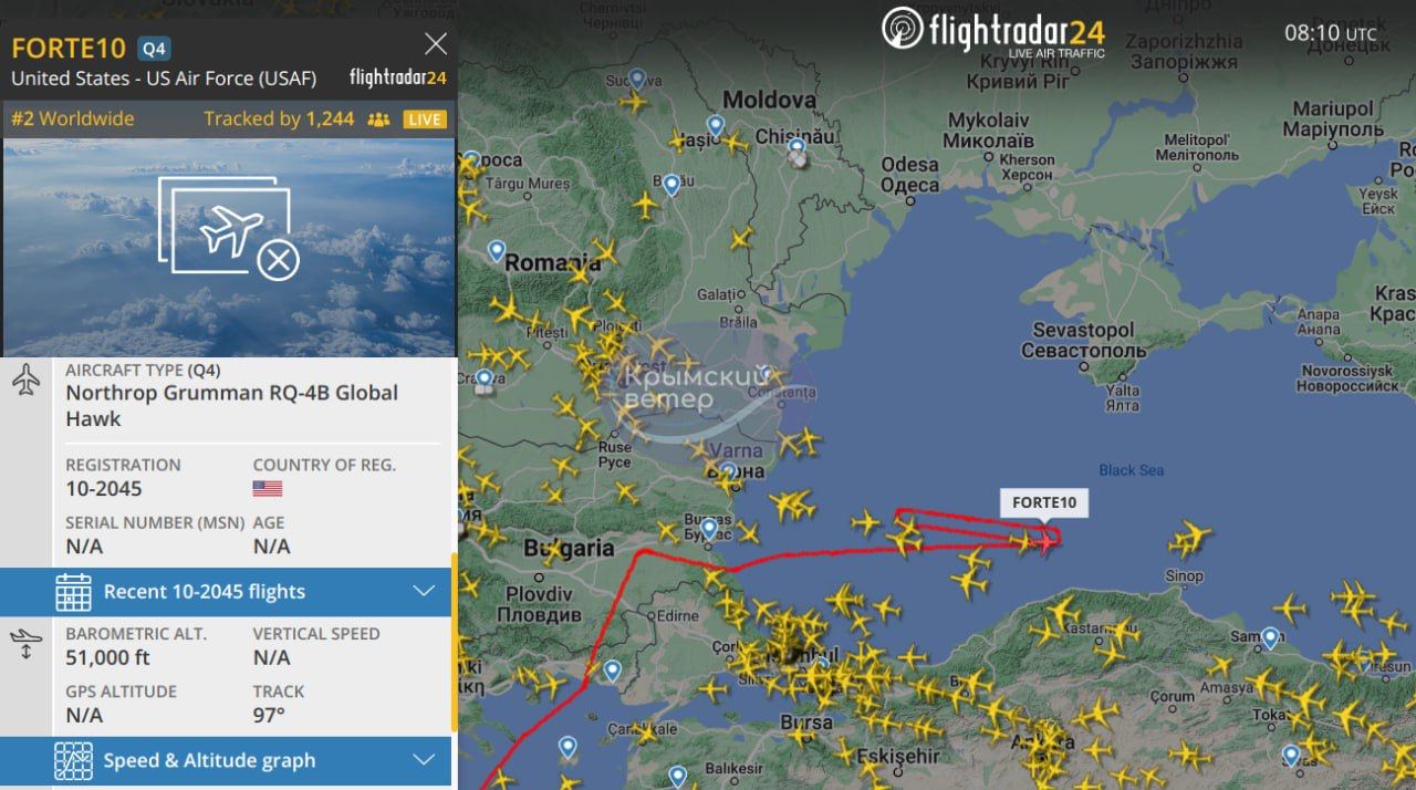 В то же время проукраинские паблики в Крыму сообщают, что пока в Севастополе звучат взрывы, американский беспилотник ведет разведку над Черным морем на удалении 100-130 км от берегов Крыма и Краснодарского края РФ.