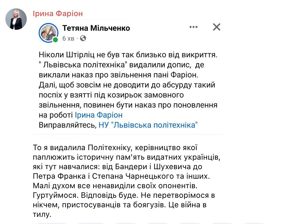 "Это я удалила Политехнику, руководство которой оскверняет историческую память выдающихся украинцев, которые здесь учились. Малые духом все ненавидели своих оппонентов. Объединяемся. Ответ будет. Не превратимся в никчем, приспособленцев и трусов. Это война в тылу", - заявила Фарион.