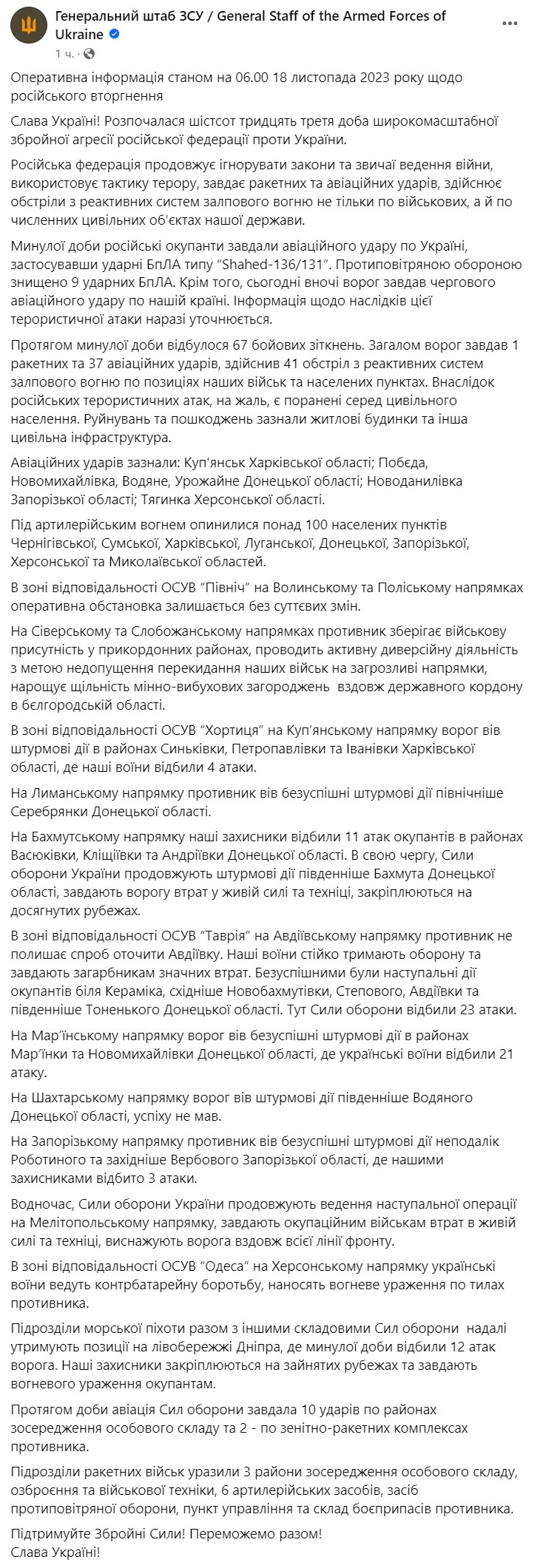 За прошедшие сутки произошло 67 боевых столкновений. Всего россияне нанесли 1 ракетный и 37 авиационных ударов, совершили 41 обстрел из реактивных систем залпового огня по позициям наших войск и населенным пунктам.