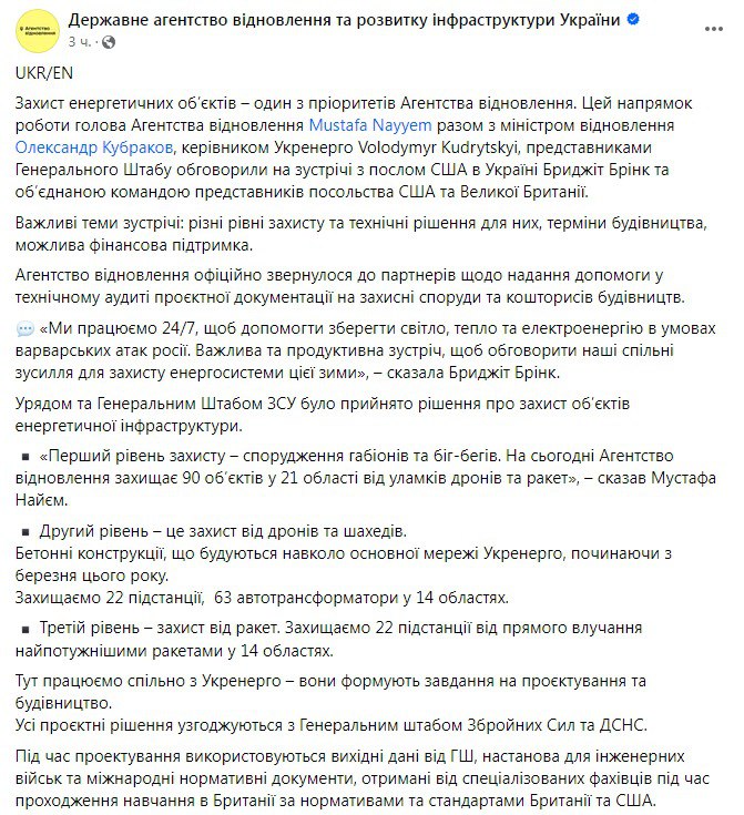 Ранее президент Владимир Зеленский ввёл в действие решение СНБО о защите объектов критической инфраструктуры. Власти поручили в 10-дневный срок усилить инженерную защиту критических объектов, увеличить число групп ПВО и создать резервы оборудования и запчастей для оперативного ремонта.