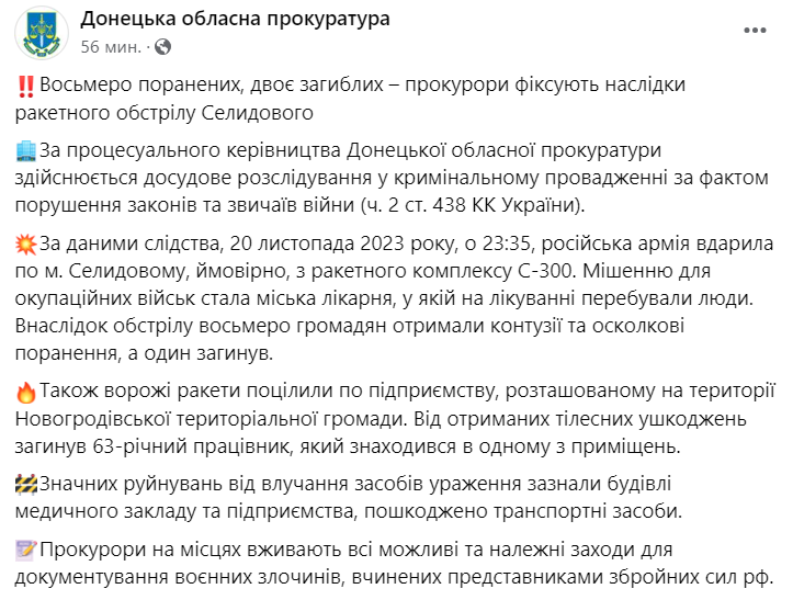 По данным следствия, 20 ноября 2023 года, в 23:35, российская армия ударила по Селидово, вероятно, из ракетного комплекса С-300 по городской больнице, в которой на лечении находились люди. В результате обстрела восемь граждан получили контузии и осколочные ранения, а один погиб.