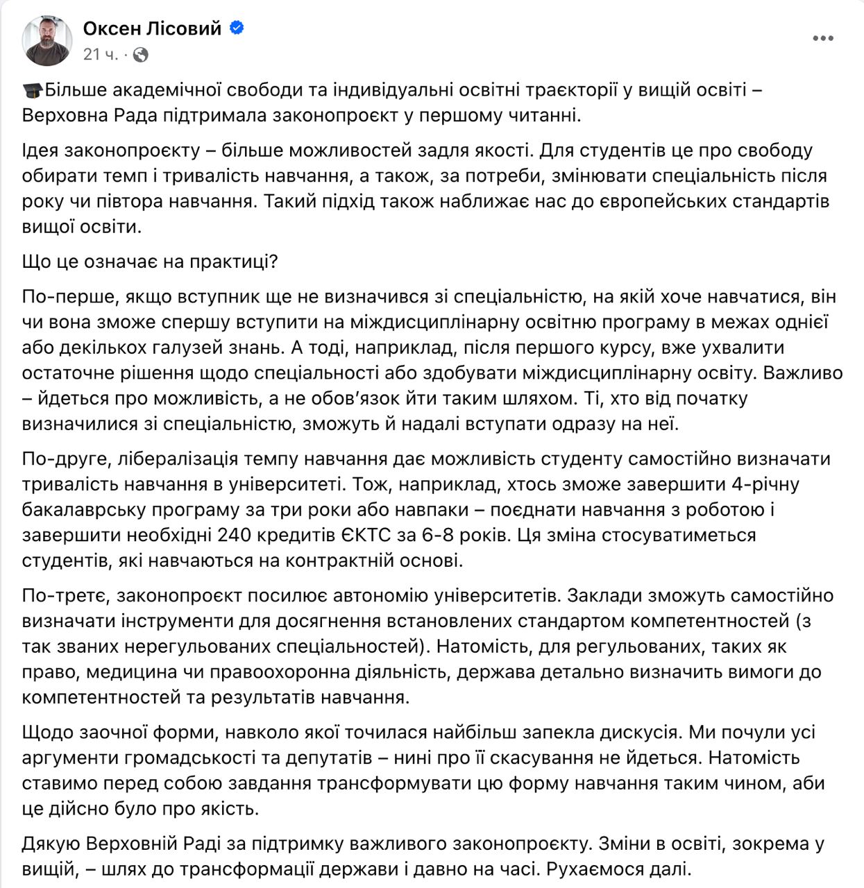 "Относительно заочной формы, вокруг которой шла самая ожесточенная дискуссия. Мы услышали все аргументы общественности и депутатов – сейчас об ее отмене речь не идет. В то же время ставим перед собой задачу трансформировать эту форму обучения таким образом, чтобы это действительно было о качестве", - написал министр.