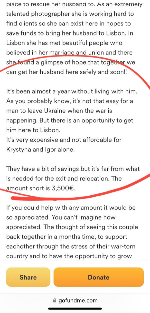 "Как вы, наверное, знаете, мужчине не так-то просто покинуть Украину, когда идет война. Но есть возможность привезти его сюда, в Лиссабон. Это очень дорого и не по карману Кристине и Игорю. Накопления у них есть, но это далеко не то, что нужно для выезда и переезда. Недостающая сумма составляет 3500 евро", — сказано в описании к сбору.