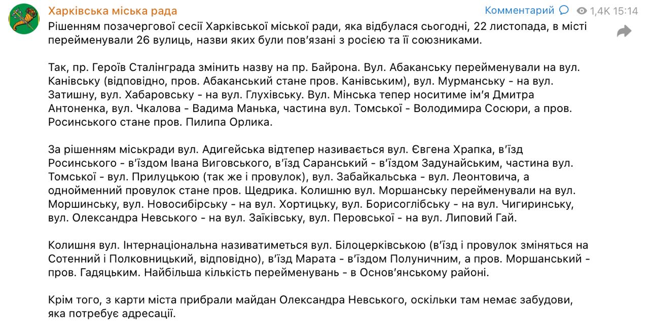 В Харькове переименовали 26 улиц. Заменили названия, которые были связаны с Россией и ее союзниками.