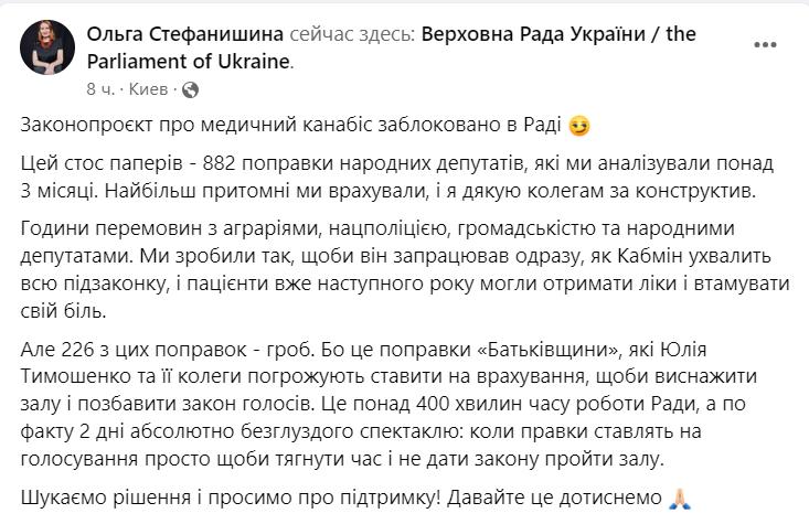 Ранее глава комитета по здравоохранению Михаил Радуцкий сообщал, что Верховная Рада уже на ближайшем заседании рассмотрит в финальном чтении законопроект о легализации медицинского каннабиса для помощи ветеранам с ПТСР.