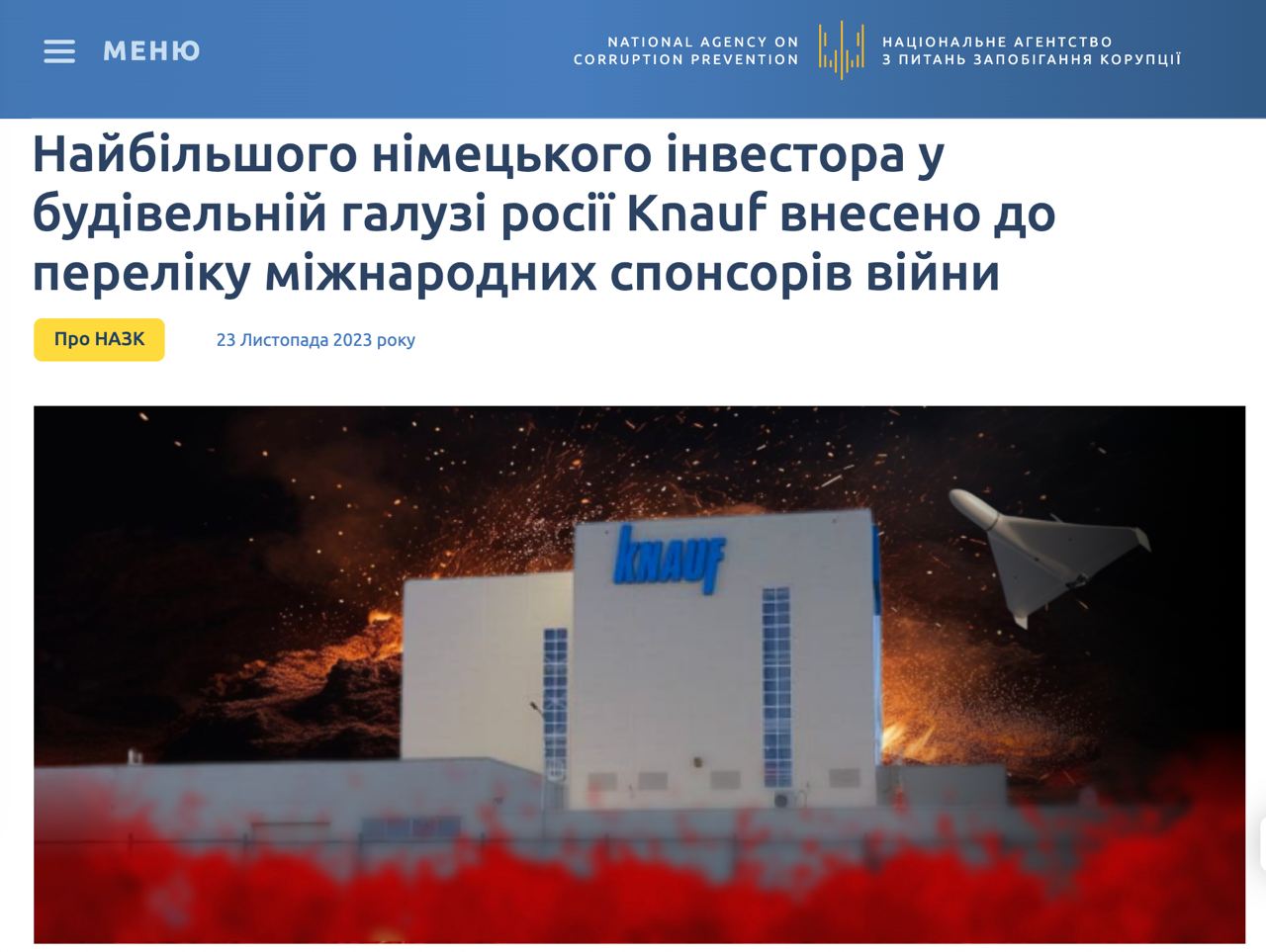 12.04 НАПК внесло в перечень международных спонсоров войны крупную немецкую строительную компанию Knauf, чей завод в украинском Соледаре был разрушен в прошлом году во время боёв за Бахмут.