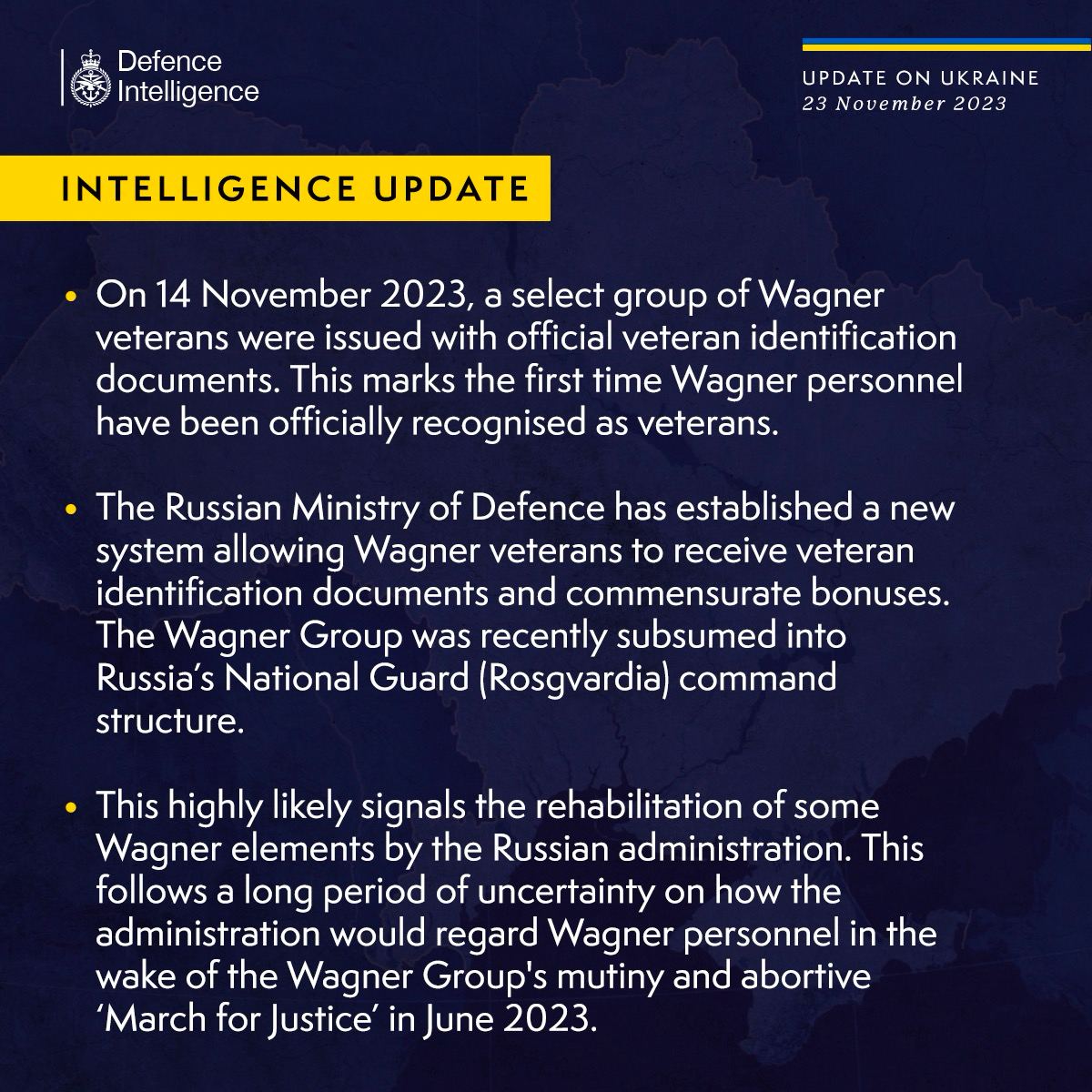"Весьма вероятно, что это сигнализирует о реабилитации некоторых элементов Вагнера со стороны российской администрации", - пишет разведка.