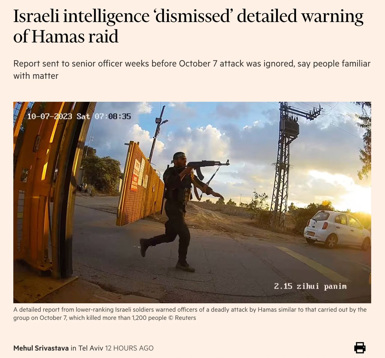 По словам источников, командование проигнорировало сигнал не только потому, что он исходил от солдат более низкого ранга, но и потому, что противоречил уверенности израильского правительства в том, что оно сдержит ХАМАС посредством карательной блокады, бомбардировок его военных объектов и умиротворения деньгами и помощью.