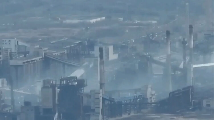На видео можно заметить, насколько обширна территория, занимаемая предприятием. Значительная часть завода окутана дымом от недавнего обстрела и, несмотря на плохую видимость, можно заметить разрушения многих построек. На дальнем плане, за трубами коксохимического комбината, также виден дым после разрыва боеприпаса.
