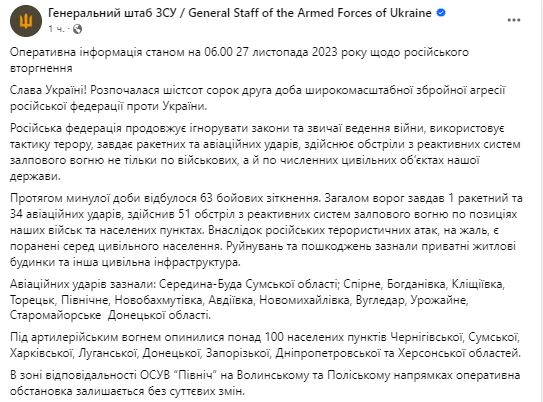 В подельник, 27 ноября, Генштаб ВСУ обнародовал сводку о ситуации на фронте.