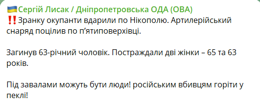 Ранее мы писали, что при обстреле войсками РФ Никополя Днепропетровской области погибла женщина и был ранен мужчина.