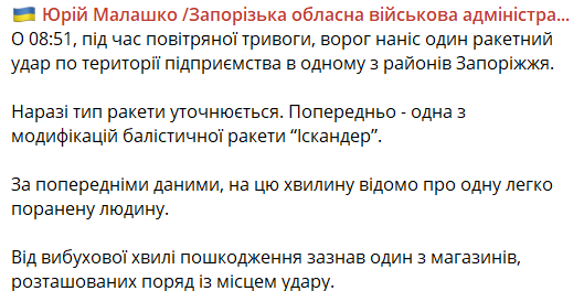 В Запорожье ракета поразила территорию предприятия, ранен один человек