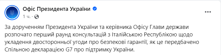 Украина начала переговоры с Италией по заключению двустороннего соглашения о гарантиях безопасности.