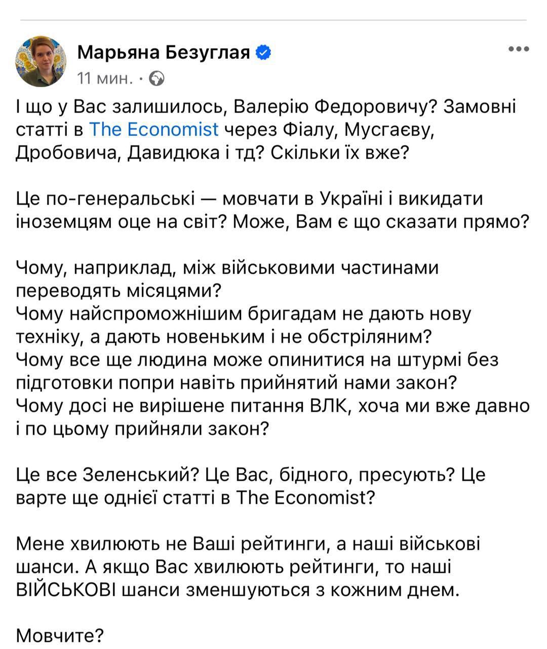 "Что у Вас осталось, Валерий Федорович? Заказные статьи в The Economist через Фиалу, Мусаеву, Дробович, Давидюк и т.д.? Сколько уже их? Это по-генеральски - молчать в Украине и выбрасывать иностранцам это в мир? Может, вам есть что сказать прямо?" - написала нардеп в Фейсбуке.