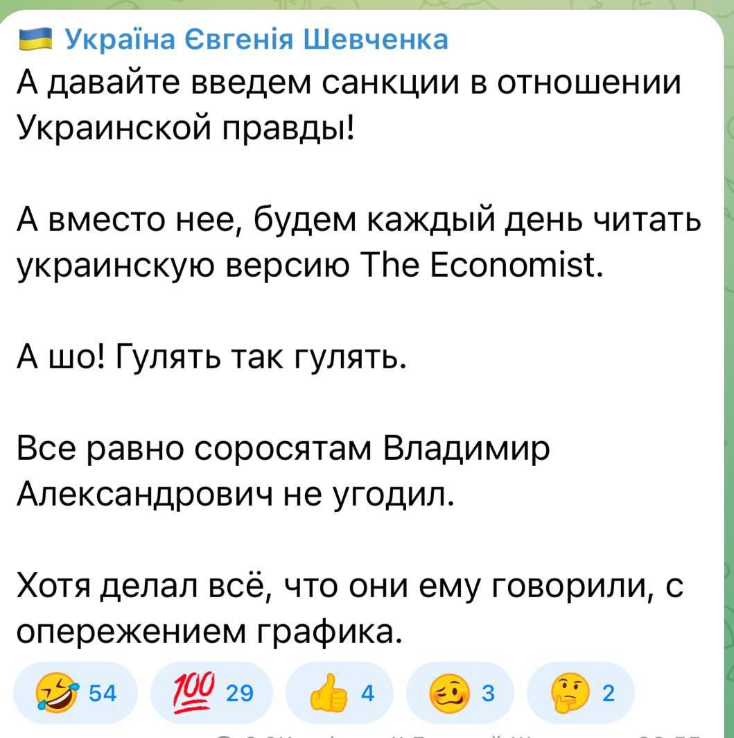 А близкий к главе ГУР Кириллу Буданову народный депутат Евгений Шевченко предложил ввести санкции против УП и написал в Телеграм, что Зеленский "не угодил соросятам".