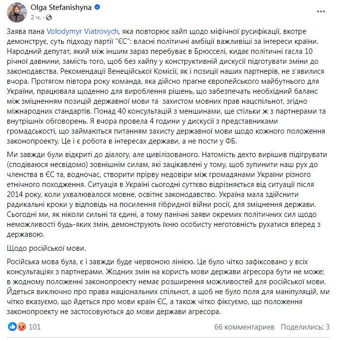 "О русском языке. Русский язык был, есть и всегда будет красной линией. Это было четко зафиксировано во всех консультациях с партнерами. Никаких изменений в пользу языка государства-агрессора быть не может; ни в одном положении законопроекта нет расширения возможностей для русского языка. Речь идет исключительно о правах национальных сообществ, а чтобы не было поля для манипуляций, мы четко указываем, что речь идет о языках стран ЕС, а также четко фиксируем, что положения законопроекта не применяются к языку государства-агрессора", - заявила Стефанишина.