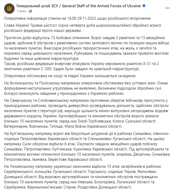 Что происходит на фронте 29 ноября. Вечерняя сводка Генштаба ВСУ