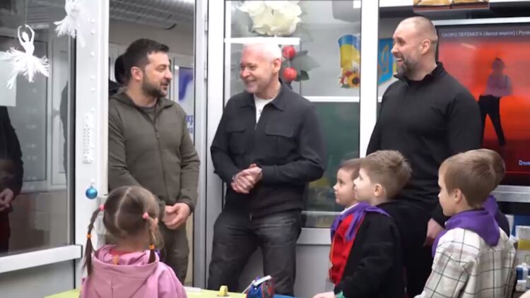 Владимир Зеленский с мэром Харькова Игорем Тереховым и главой Харьковской ОВА Олегом Синегубовым в подземной метрошколе. Скриншот видео