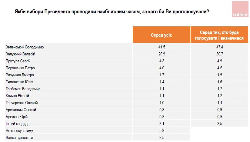 На гипотетических выборах, в которых бы участвовал и Зеленский, и Залужный, никто из них не одержал бы победы в первом туре (у Зеленского - 47,4%, у Залужного - 30,7% среди тех, кто определился с кандидатурой).
