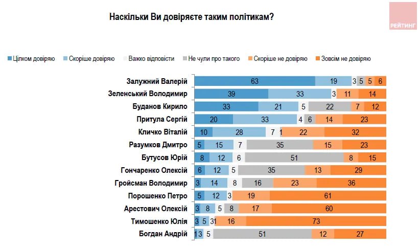 Залужному "целиком доверяют" 63% опрошенных (Зеленскому 39%), "скорее доверяют" 19% (у президента здесь 33%). То есть в целом доверие к главкому держится на уровне 82%, а к главе государства - 72%.