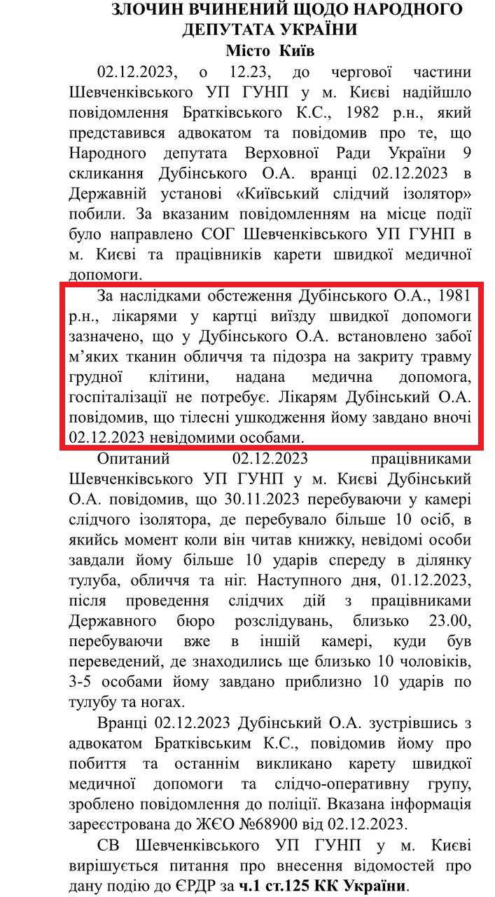 "По результатам обследования Дубинского А.А 1981 г.р. врачами в карточке выезда скорой помощи сказано, что у Дубинского А.А. установлены ушибы мягких тканей лица и подозрение на закрытую травму грудной клетки, оказана медицинская помощь, в госпитализации не нуждается. Врачам Дубинский А.А. сообщил, что телесные повреждения ему нанесены ночью 2.12.2023 неизвестными лицами", - сказано в документа.