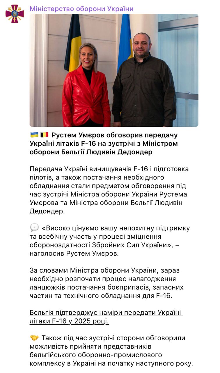 В октябре министр обороны Бельгии заявляла, что поставка будет зависеть от передачи Бельгии новых F-35, но планируют поставить первые F-16 в 2025 году.