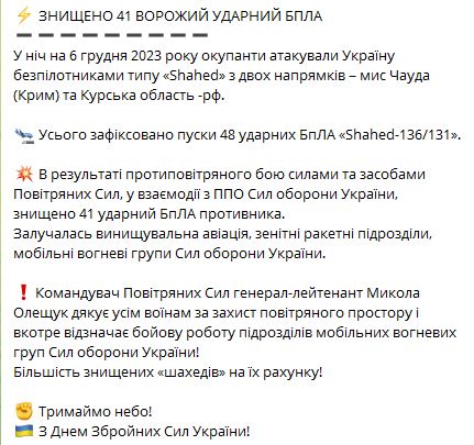 Ночью 6 декабря во время очередной воздушной атаки РФ был сбит 41 беспилотник.