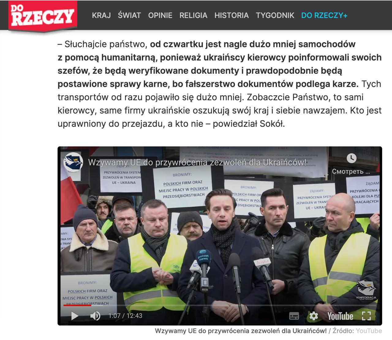 "Слушайте, дамы и господа, с четверга машин с гуманитарной помощью вдруг стало гораздо меньше, потому что украинские водители сообщили своему начальству, что документы будут проверены и, возможно, будут возбуждены уголовные дела, потому что подделка документов наказуема. Этих транспортов появилось сразу гораздо меньше. Видите ли, это сами водители, сами украинские компании обманывают свою страну и друг друга. Кто имеет право путешествовать, а кто нет", - заявил Яцек Сокол.
