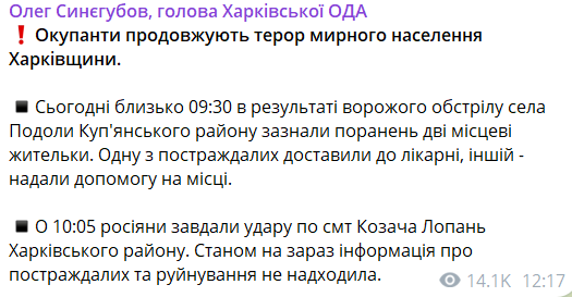 "Сегодня около 09:30 в результате вражеского обстрела села Подолы Купянского района получили ранения две местные жительницы. Одну из пострадавших доставили в больницу, другой – оказали помощь на месте", - написал он.