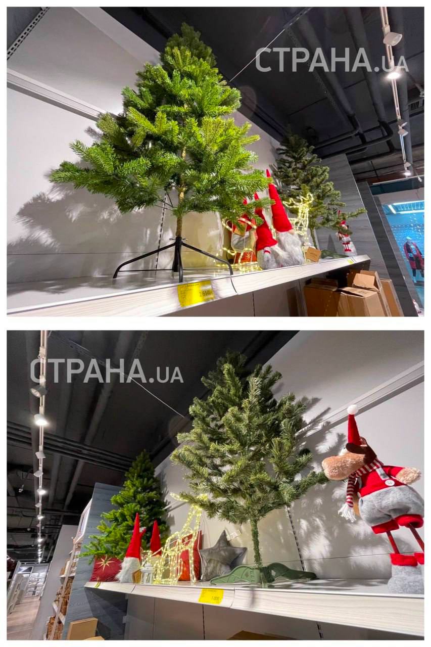 Также искусственные елки появились в магазине "Юск". Правда, здесь выбор искусственных елок очень маленький. На витрине представлены буквально два дерева: одно по сниженной цене (его можно купить за 1000 грн), второе обойдется почти в 3000 грн.