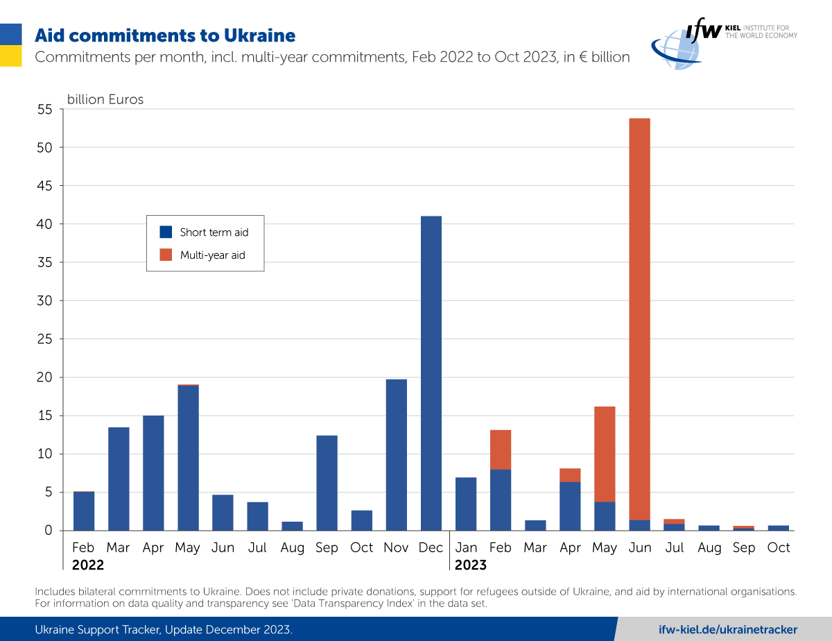 Помощь Украине в августе-октябре 2023 года упала почти на 90% по сравнению с аналогичным периодом прошлого года. Ее объем составил 2,11 млрд евро. Это самый низкий уровень с января 2022 года.