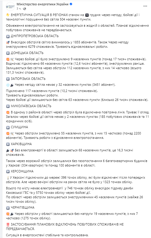 По состоянию на 9 декабря, из-за непогоды, боевых действий и технологических нарушений без света остались 504 населенных пункта.