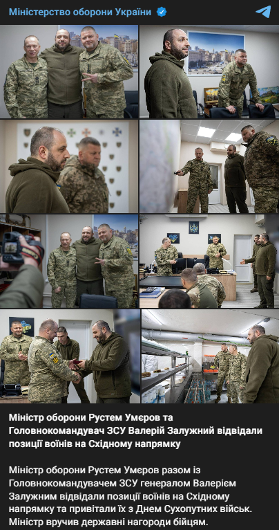 Сегодня Минобороны сообщило, что Сырский ознакомил Умерова и Залужного с ситуацией на восточном направлении, они обсудили ключевые потребности ВСУ, усиление фортификаций вдоль всей линии фронта, а также мобилизацию.