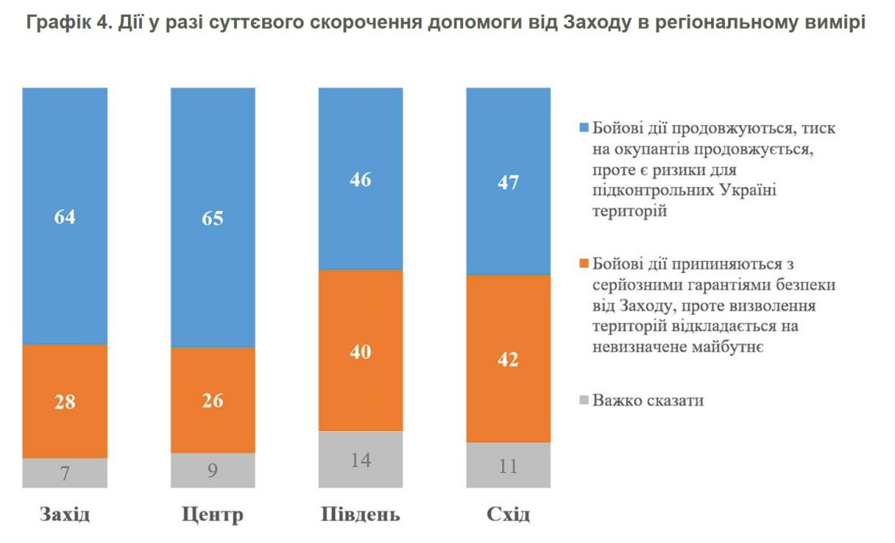 В центре Украины сторонников продолжения войны 65%, а на западе - 64%. На юге - 40%, на востоке - 42%.