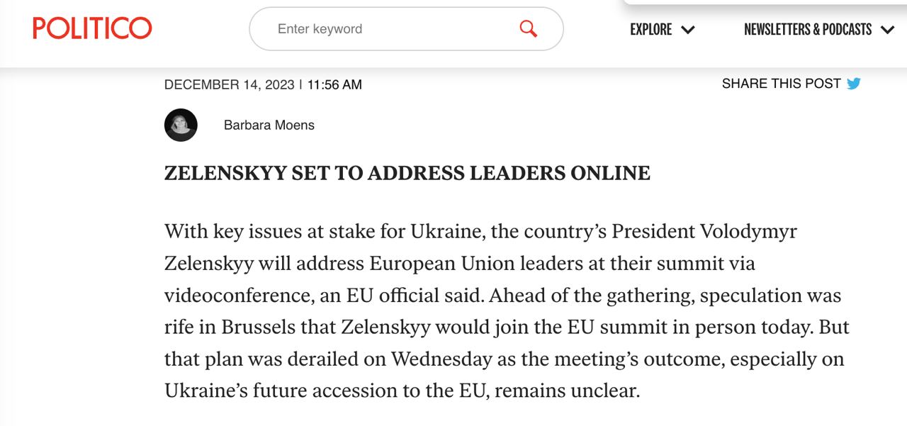 "Накануне встречи в Брюсселе распространились слухи о том, что Зеленский сегодня лично примет участие в саммите ЕС. Но этот план был сорван в среду, поскольку исход встречи, особенно по будущему вступлению Украины в ЕС, остается неясным", - сообщает издание.