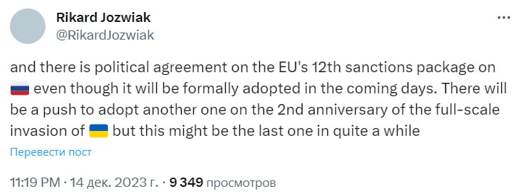 Как сообщалось, 12-й пакет санкций предусматривает введение санкций против более 120 физических и юридических лиц за их роль в подрыве суверенитета и территориальной целостности Украины. Речь идет о представителях военного, оборонного и IT-секторов РФ, а также "других важных экономических операторов". Вдобавок предлагались новые запреты на импорт и экспорт, а также меры, направленные на усиление потолка цен на нефть и противодействие уклонению от санкций Европейского Союза.