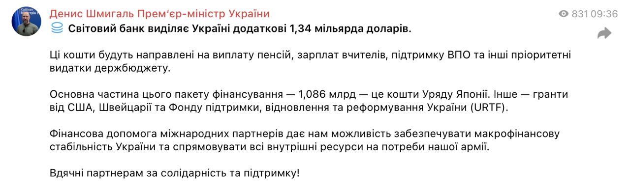 Всемирный банк выделит Украине 1,34 млрд долларов на выплату пенсий, зарплат учителей, поддержку переселенцев и другие приоритетные расходы госбюджета.