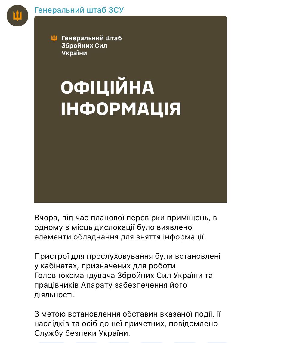 Генштаб ВСУ официально подтвердил, что в кабинете, предназначенного для работы главкома Валерия Залужного, а также в кабинетах работников его аппарата нашли прослушку.