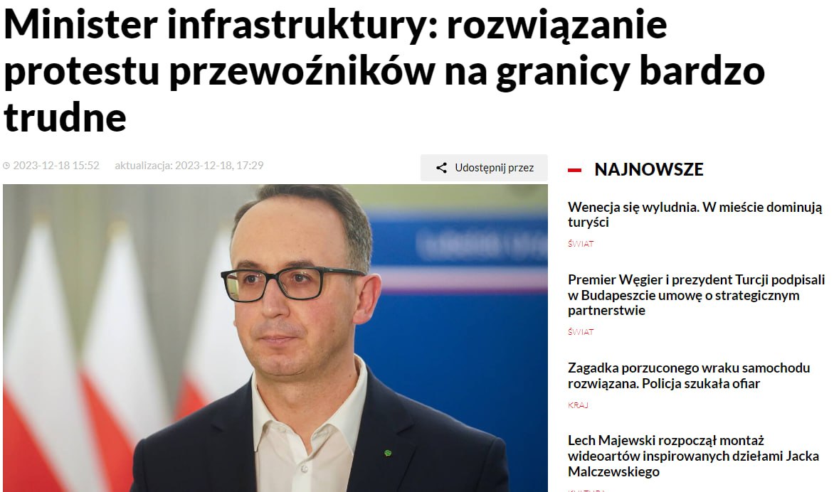 Как сообщает PAP, новоназначенный министр инфраструктуры Польши Дариуш Климчак заявил, что протест перевозчиков на границе с Украиной является "затягивающимся гордиевым узлом".
