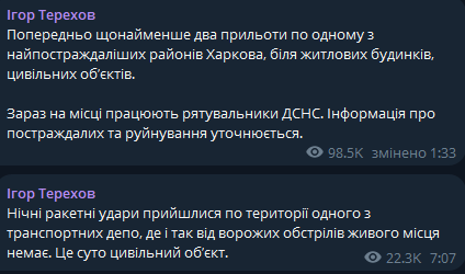 Ночью в 1:33 он сообщил, что "предварительно минимум два прилета по одному из самых пострадавших районов Харькова, возле жилых домов, гражданских объектов. Сейчас на месте работают спасатели ГСЧС. Информация о пострадавших и разрушениях уточняется".