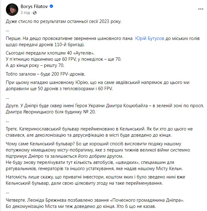 "Леонида Брежнева лишили звания "Почетный гражданин Днепра" (на самом деле Днепропетровска: во времена СССР город назывался не Днепр - Ред.). Потому что декоммунизацию города мы тоже доведем до конца. Не важно, что кто-то говорит", - написал Филатов.
