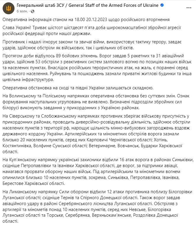 Война в Украине идет уже 665-й день. Мы следим за последними новостями и ключевыми событиями 20 декабря 2023 года в обновляемом онлайне.