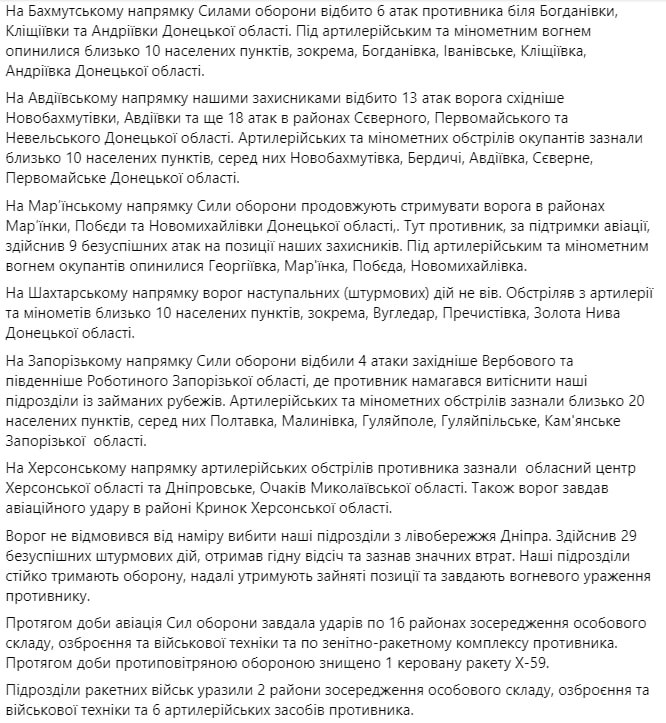 В течение суток авиация Сил обороны нанесла удары по 16 районам сосредоточения личного состава, вооружения и военной техники и по зенитно-ракетному комплексу противника. В течение суток противовоздушной обороной уничтожена 1 управляемая ракета Х-59.
