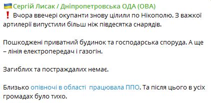 07.51 Вчера вечером россияне ударили по Никополю в Днепропетровской области. Из тяжелой артиллерии выпустили полдесятка снарядов.