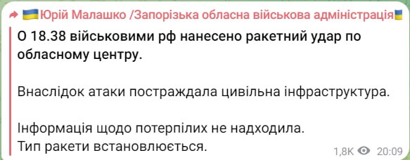 20.13 По Запорожью нанесен ракетный удар, пострадала гражданская инфраструктура.