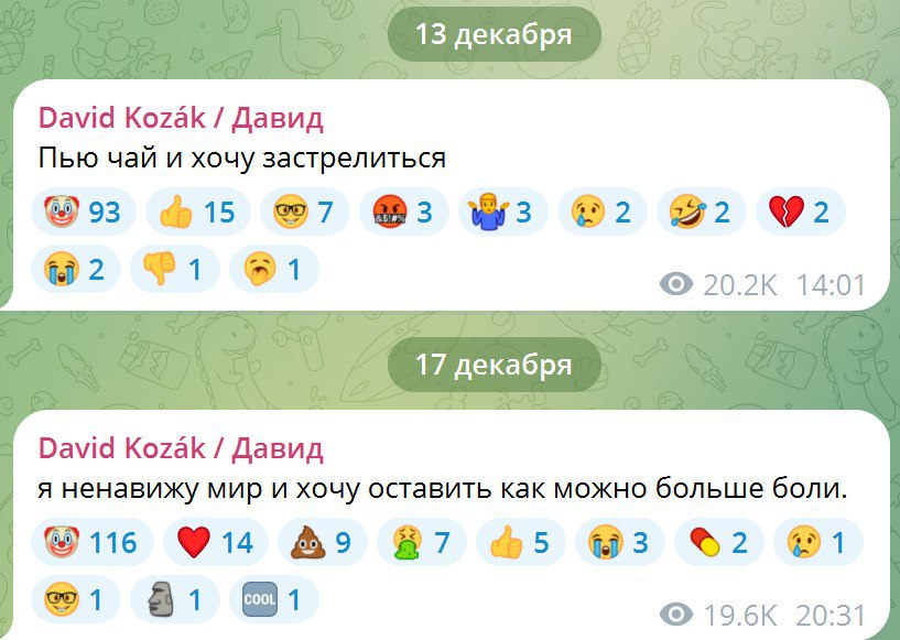 Отмечается, что стрелок мог анонсировать свои убийства в Telegram. В мессенджере есть канал David Kozák, созданный 9 декабря. Велся он на русском языке.
