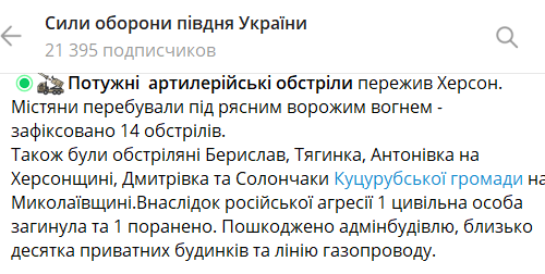 В областном центре зафиксировано 14 прилетов. Также были обстреляны Берислав, Тягинка и Антоновка.