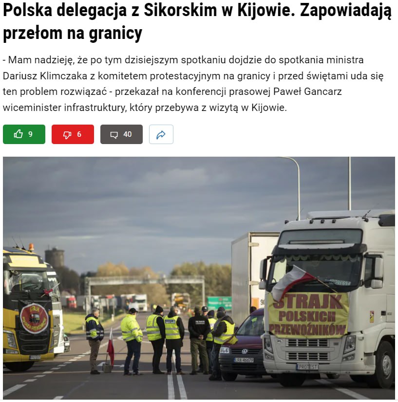 Однако новоназначенный министр инфраструктуры Польши Дариуш Климчак заявил, что протест перевозчиков на границе с Украиной является "затягивающимся гордиевым узлом". По его словам, быстро разблокировать границу пока невозможно.